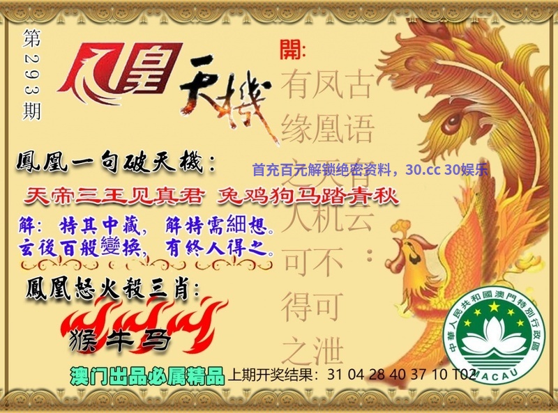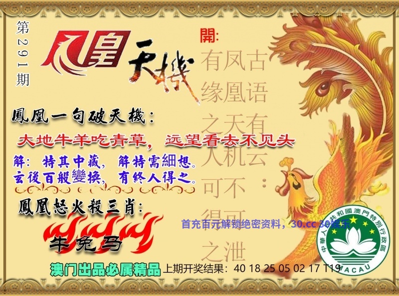 296期正版诗象(开發00) 今期生肖出南方,风吹草动见牛羊 推荐肖:鸡虎马狗羊鼠 |